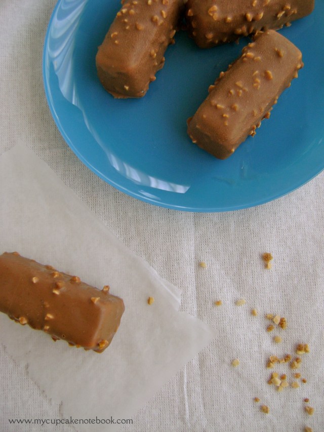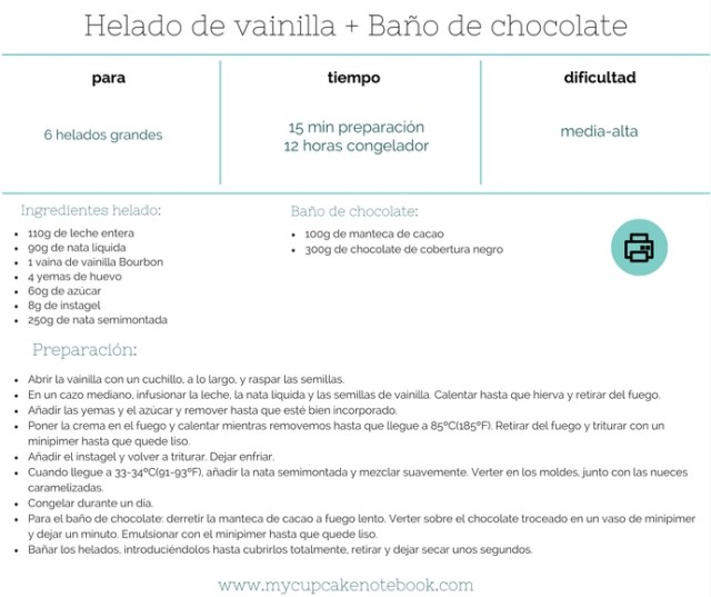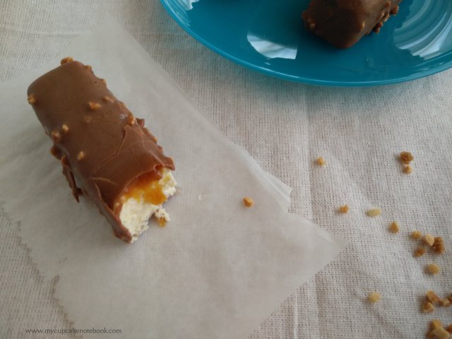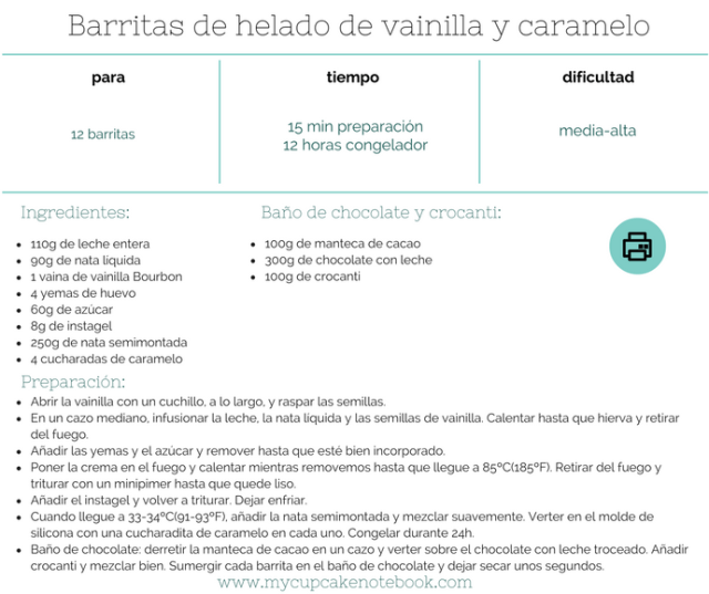Empezamos a notar el cambio de temperatura por aquí, pero yo sigo con mi lista de helados favoritos de éste verano… Hoy tocan barritas de helado, unos bombones deliciosos, de vainilla y caramelo salado casero, cubiertos de una fina capa de chocolate con leche con crocanti. ¿No se os hace la boca agua?