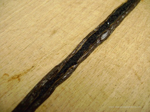 - Abrir la vainilla con un cuchillo, a lo largo, y raspar las semillas.