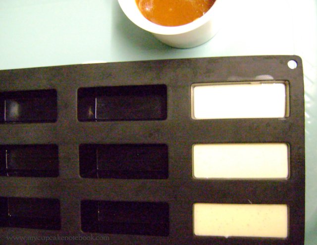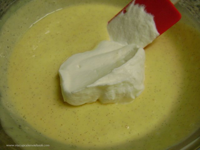 - Cuando llegue a 33-34ºC(91-93ºF), añadir la nata semimontada y mezclar suavemente. Verter en el molde de silicona con una cucharadita de caramelo en cada uno. Congelar durante 24h.