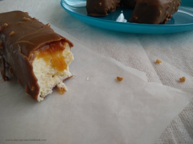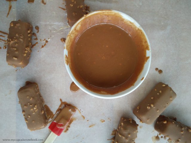 - Baño de chocolate: derretir la manteca de cacao en un cazo y verter sobre el chocolate con leche troceado. Añadir crocanti y mezclar bien. Sumergir cada barrita en el baño de chocolate y dejar secar unos segundos.